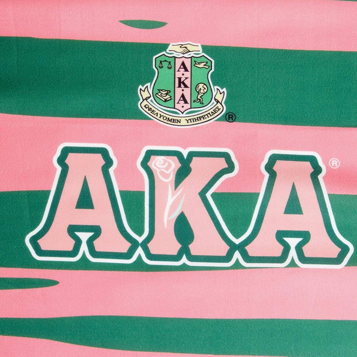 Alpha Kappa Alpha Sorority Paraphernalia Scarf for Women. Pink and Green Zebra Stripe Fashion Shawl Scarf Featuring Large AKA and Small Shield Print Detail. Fringe Edge Measures 4". Backside of Scarf is White. 100% Polyester.