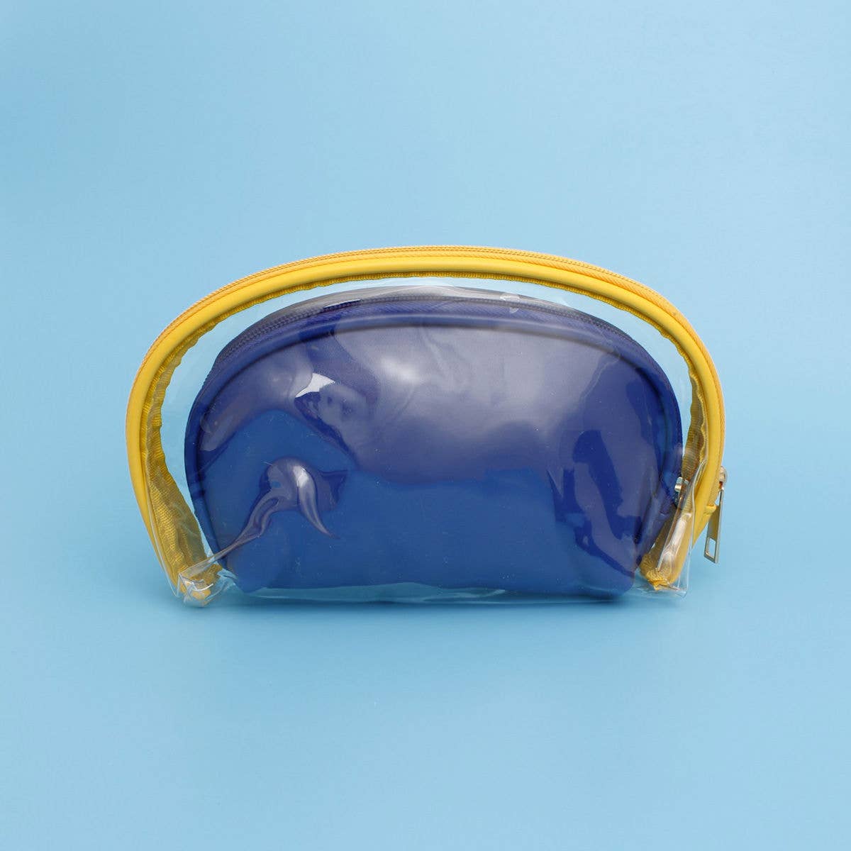 Sigma Gamma Rho Sorority Paraphernalia Women's Cosmetic Pouch Set. Includes Clear PVC Cosmetic Pouch with Yellow Zipper Edge Trim Featuring Woman and SGRHO Graphic Print. Plus Smaller Blue Faux Leather Zipper Pouch Measuring 6.5 x 2.75 x 4.5 inches.