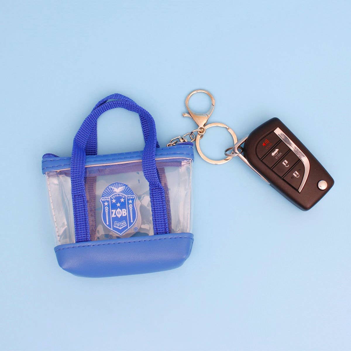 Zeta Phi Beta Sorority Paraphernalia Women's Zipper Pouch Keychain. Clear PVC Mini Tote Bag Shaped Zipper Pouch with Canvas Straps Featuring Blue and White ZPB Shield Graphic Print. Perfect for AirPods. Silver Metal Keychain Ring and Handbag Clip. Graphic Print is Featured on Both Sides.