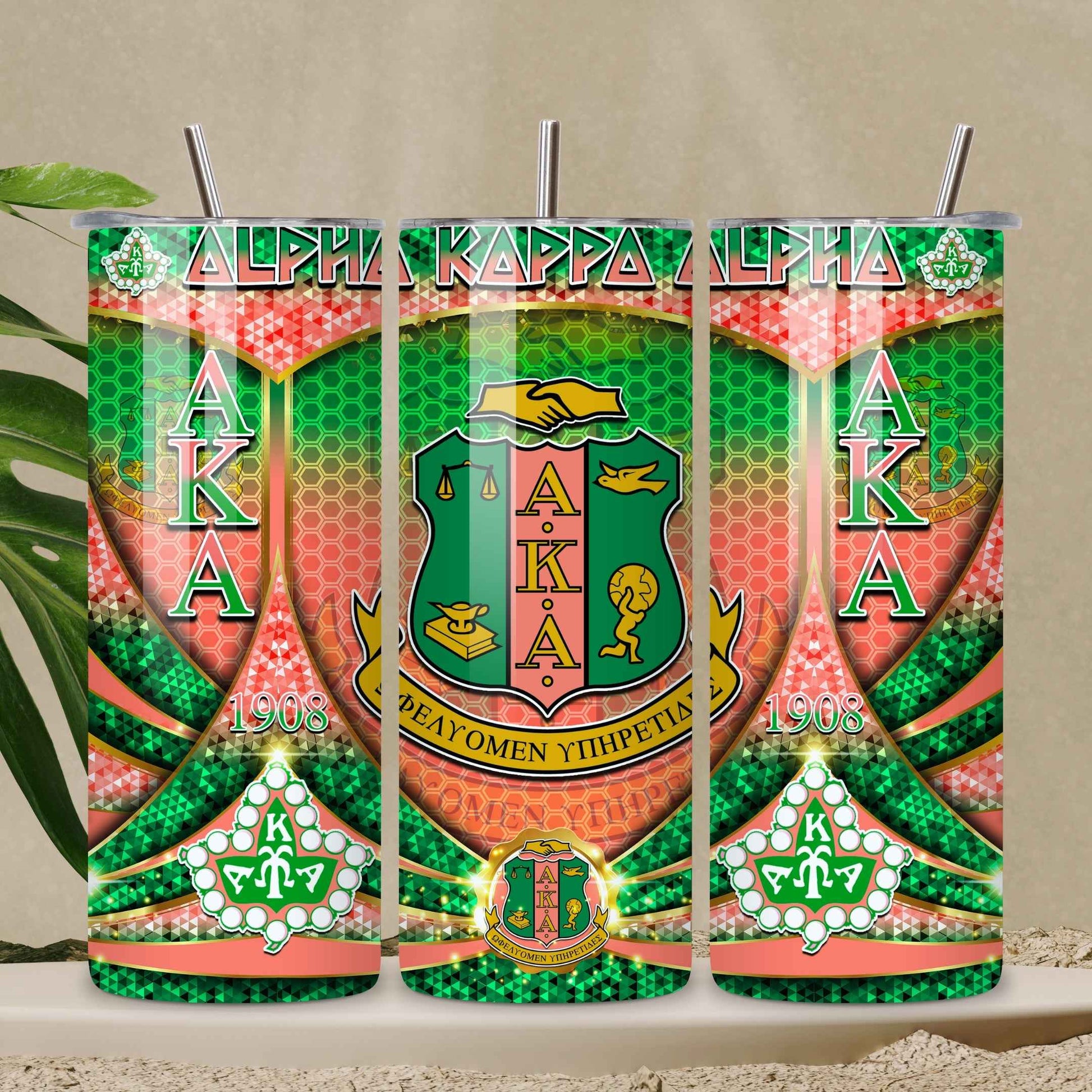 The AKA Skinny Tumbler is the perfect way to show off your Alpha Kappa Alpha pride while staying hydrated on the go. This 20 oz tumbler features a crest, founding year, ivy leaf, and pearls, all beautifully displayed on a sleek and slender design. Whether you're on your way to class, work, or the gym, this tumbler will keep your drinks at the perfect temperature all day long. Made from high-quality materials, it's both durable and stylish, making it the perfect gift for any fellow AKA sister. Add it to your drinkware collection today and sip in style.