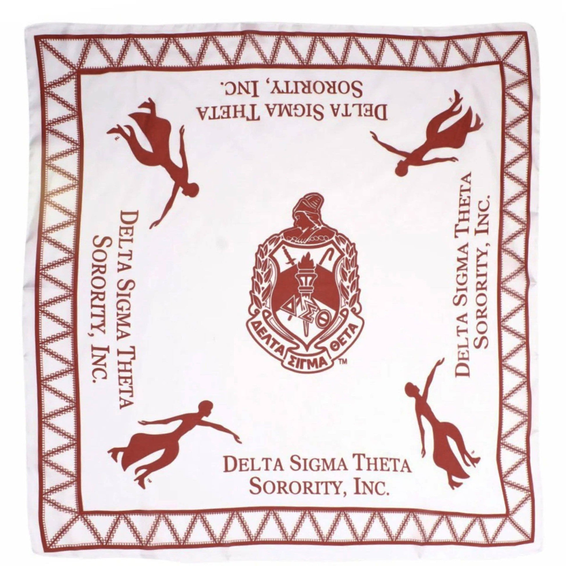Delta Sigma Theta Sorority Paraphernalia Women's Scarf. Large White with Red Silky Square Scarf Featuring DST Shield and Lady Fortitude Print Design with Zigzag Stripe Edging. Silky 100% Polyester.