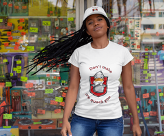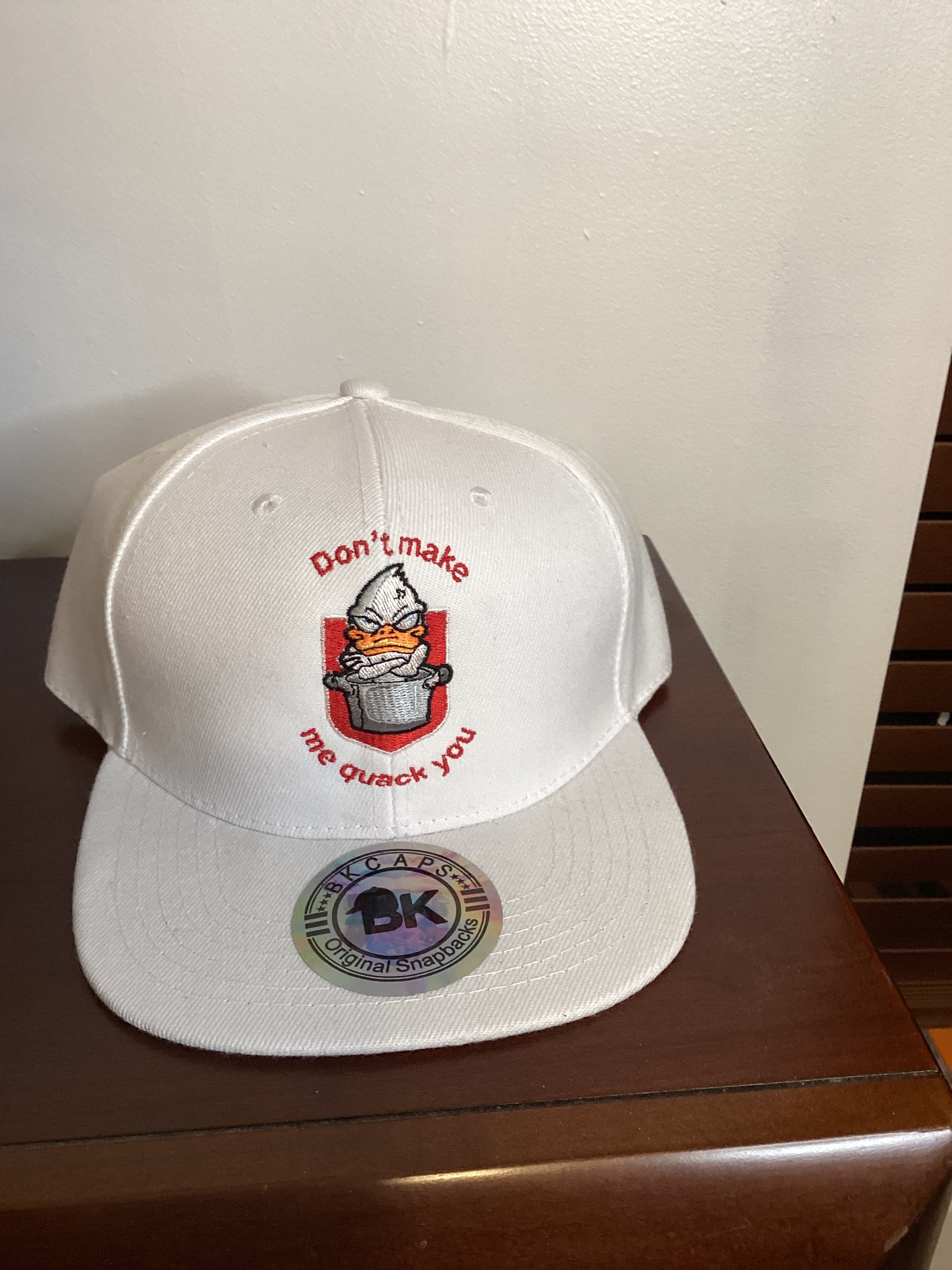 Keep it casual and make a statement! Duck Stew's Don't Make Me Quack You Snap Backs feature a relaxed fit and white hat, perfect for everyday wear. The bold message from the duck is sure to turn heads and show off your unique style! Featuring a flat peak, contrast branding an adjustable snapback closure, this cap is a stylish accessory that will upgrade any outfit. Get ready for adventure with our Duck Stew Snap Backs! Perfect for kids and adults, these hats come in both white and black. With high demand and our low price, these snap backs are a must-have for risk-takers everywhere!